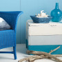 Paint an old crate in a tonal scheme of Resene Double Bianca (top), Resene Breeze (middle) and Resene Seeker (bottom) and use it as a coffee table. The chair is painted in Resene Captain Cook, the basket is in Resene Waterfront, the floor is in Resene Double Bianca and the wall is in Resene Meltwater.