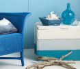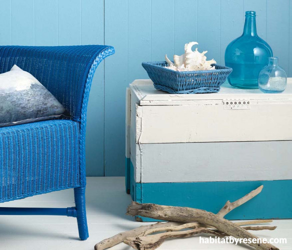 Sea-inspired blues, a woven rug and an old painted crate – you can almost smell the salty tang of the beach. Rather than paint the crate in just one colour, we’ve taken advantage of the different boards to use a tonal scheme of Resene Double Bianca (top), Resene Breeze (middle) and Resene Seeker (bottom). The Lusty’s Lloyd Loom chair to the side is painted in Resene Captain Cook, the basket is in Resene Waterfront, the floor is in Resene Double Bianca and the wall is in Resene Meltwater.