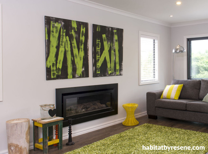 This creative homeowner needed an eye-catching artwork for the wall above his fireplace so he painted a couple of ready-made canvases in Resene Black, and using a small roller and a testpot of Resene Limerick, he created a striking artwork reminiscent of bamboo stems. Perfect!