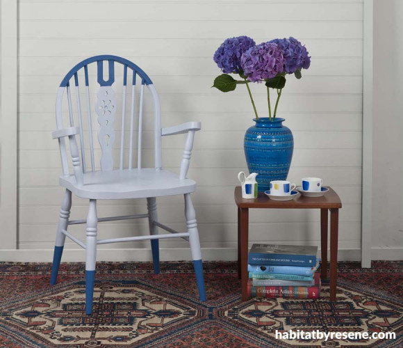 The paint-dipped look is easy to create and very on-trend. This old chair has been base-coated in Resene Alaska, then the legs and top ‘dipped’ in Resene Limitless. The wall behind is painted in Resene Black Haze.