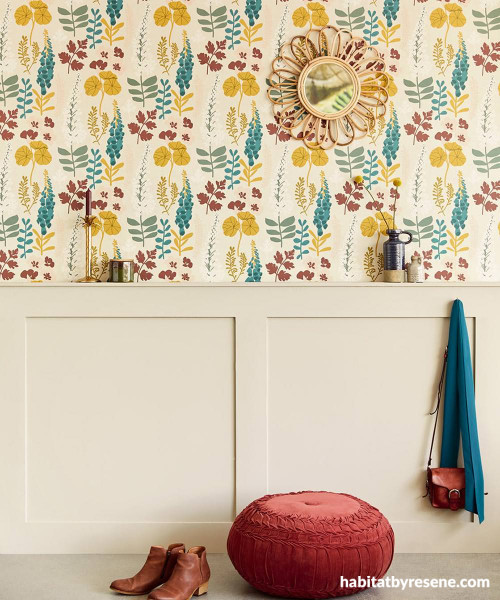 Resene Wallpaper Collection E384533 looks great in this entranceway paired with a colourful ottoman. For a lower wall colour that complements this casual look, try Resene Spanish White.