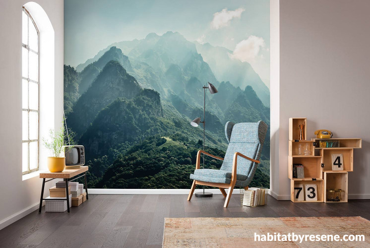 No view? No problem. With Resene’s range of photo murals and illustrative wallpapers, you can reinvent your home’s surroundings in no time. With a choice of calming mountain ranges or sunset vistas, pristine beaches or elegant cityscapes, you can transform your office or bedroom into an idyllic escape. These bold, lush landscapes are perfect for feature walls, where they can shine without overwhelming the space. Surround your feature wall mural in a white tinted to the main tone of your mural. For example, Resene Wallpaper Collection PSH033-VD3 has a rich range of green hues. Complement it with adjacent walls painted in Resene Merino, a light and versatile off-white with a green oxide undertone. This will help the mural to sit calmly within the space and ensure a seamless flow between wallpaper and paint.