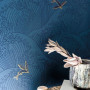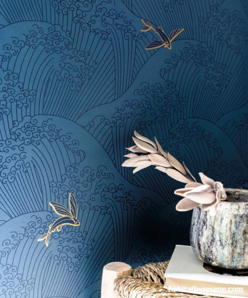 Resene Wallpaper Collection HAN 100396822 is inspired by Japanese artist Hokusai, famous for his stylised ocean drawing, The Great Wave off Kanagawa. Create a serene space by pairing this bold blue design with a soft neutral such as green/white Resene Rice Cake and a soft pink such as Resene Vanilla Ice, reminiscent of blossoms.