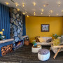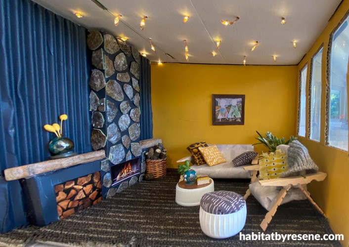 Kim Lawrence of Motueka was awarded a special prize for best renovation for reconfiguring the design of her teeny house. Kim added some design elements inspired by mid-century modern Palm Springs style such as the sloping roof, breeze blocks and a colour block entrance with a door in Resene Tango and a wall made of squares of Resene paint colours. The judges liked the commitment to the style. “This house is so much fun. The breeze blocks and 70s fireplace were a lovely touch, and we loved the use of the lobster wallpaper (Resene Wallpaper Collection 289595) in the living room,” said the judges.