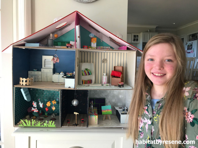 Maya’s Teeny House was her staycation project and featured bold colours throughout including Resene Tulip Tree, “I love the happiness of Tulip Tree,” she says. In the living room, she used pegs to create Danish style chairs, bottle caps for poufs and a feature wall made of corrugated cardboard painted in Resene Tarawera. “The peg chairs in particular were very innovative,” said one of the judges. “The Resene Tulip Tree makes me smile,” said another.