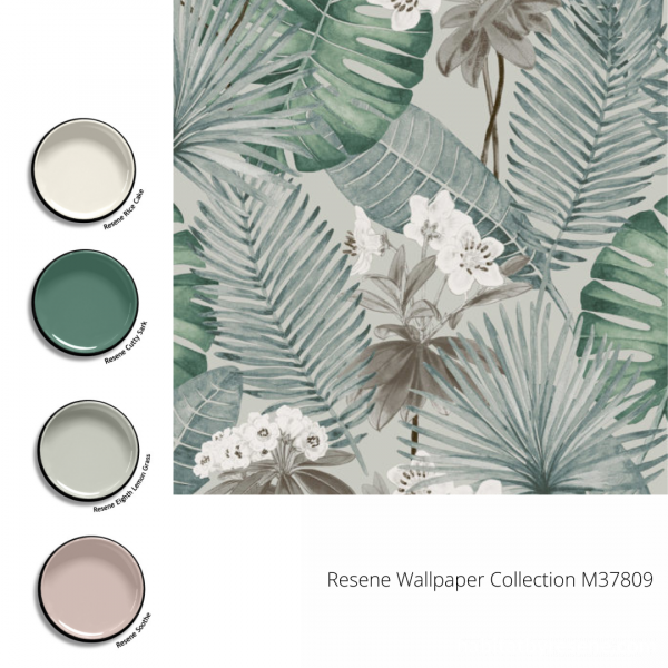 Resene Wallpaper Collection M37809 + Resene Rice Cake + Resene Cutty Sark + Resene Eighth Lemon Grass + Resene Soothe