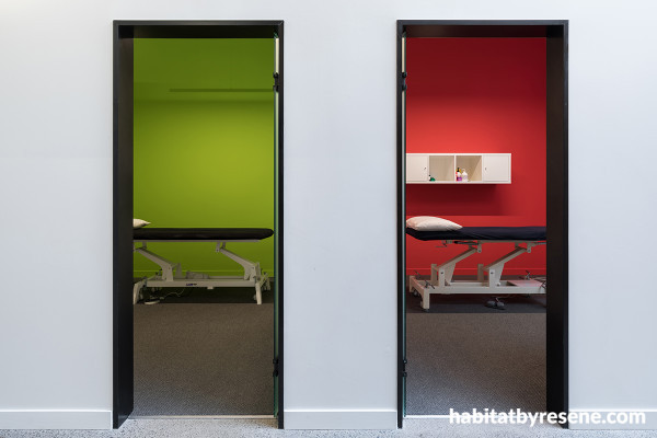 For the design of In Good Hands Physio, Michael Cooper Architects used a number of electric statement colours to bring energy to the dynamic space. Resene Limerick (left) and Resene Red Hot (right) do a bang-up job of helping to motivate patients to get moving in these two treatment rooms while the walls of the hallway have been kept neutral in Resene Black White.