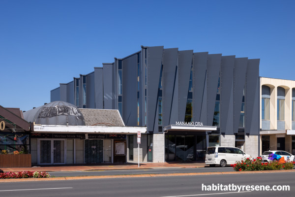 On the exterior, the upper panels are in New Denim Blue, a nod to the depth of the Pacific Ocean. The exposed canopy steel and lettering is painted in Resene Double Sea Fog. Image by Simon Devitt.