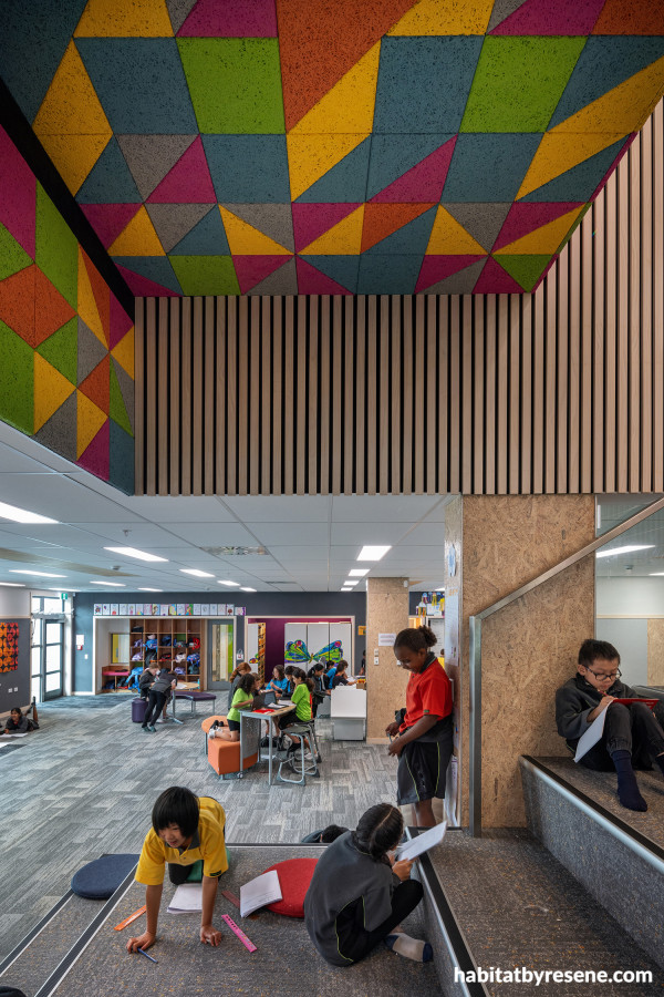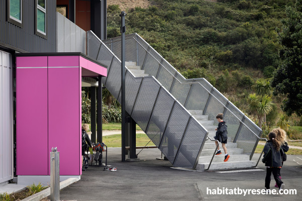 Now, with a rising roll and the suburb continuing to expand, the school has added a new two-storey building that extends the original design – and once again, colour plays a leading role.