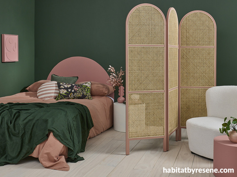 Darker, forest toned greens work well with dusky reds and warm pinks. In this space, the wall is painted in Resene Forest Green and arch headboard and reading area side table in Resene Coral Tree. The edge of the Mocka rattan screen is painted in Resene Summer Rose, flooring is stain colour washed in Resene Colorwood Breathe Easy, bedside table in Resene Meringue and DIY artwork, vases and other accessories in Resene Coral Tree and Resene Meringue. Bedlinen from Adairs, throw from H&M Home, cushions from Mocka, Adairs and H&M Home. Project by Vanessa Nouwens, image by Bryce Carleton.
