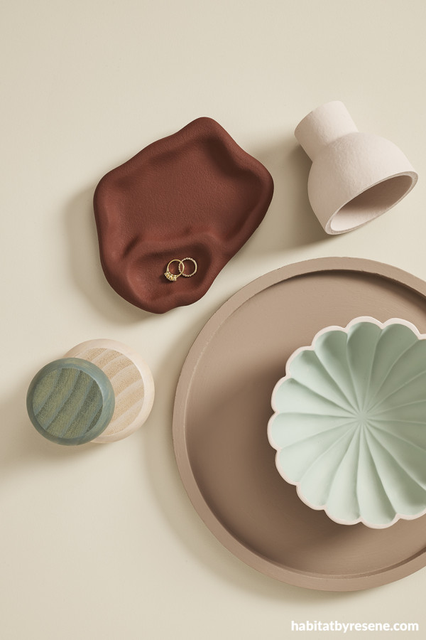 Background painted in Resene Half Tea, organic textured dish in Resene Trek, small vase in Resene Contented, large round tray in Resene Otter, scalloped bowl in Resene Eau De Nil with trim in Resene Contented and wooden coat hook finished in Resene Colorwood Rising Tide and Resene Colorwood Becalm.