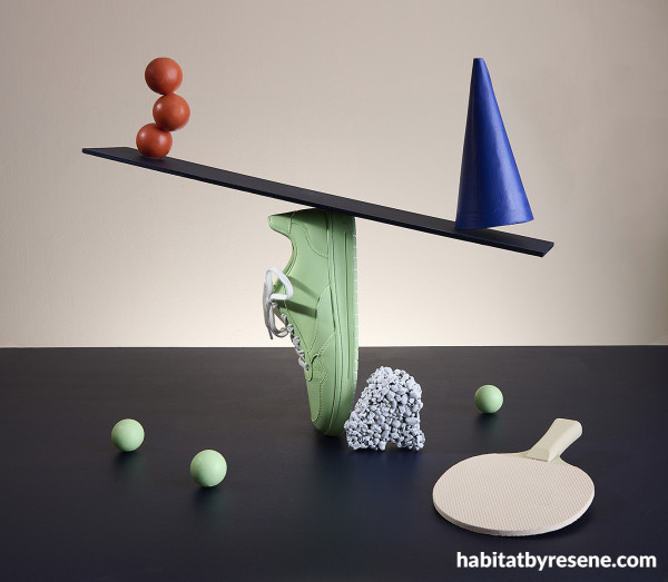 The Red Alert section of BlackWhite magazine showcases on trend colour palettes in unique ways. Wall in Resene Just Right, floor and balance board in Resene Blue Night, stacked balls in Resene Kamikaze, shoe and balls on floor in Resene Feijoa, cone in Resene Decadence, paddle in Resene Just Right with handle in Resene Coral and rock in Resene Snow Drift.