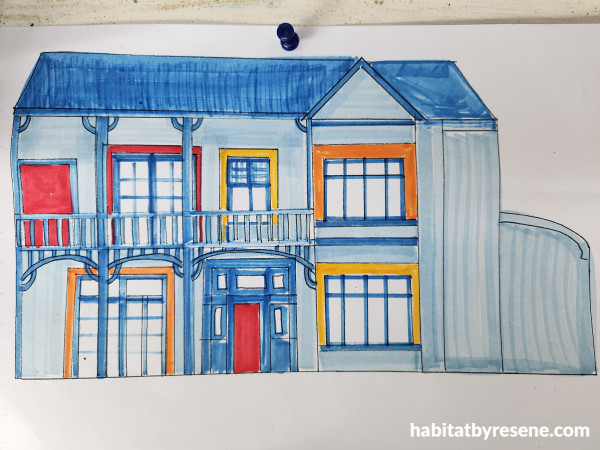 The client’s initial drawing of their exterior colour scheme, which was matched brilliantly with the vibrant Resene paint colours by Sims & Blue.