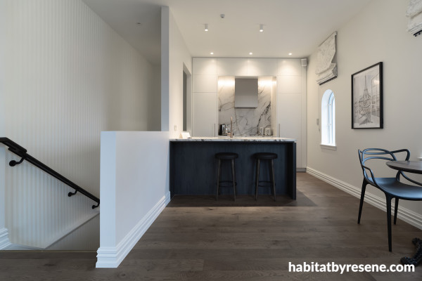 The stairwell balustrade is painted in the dark shade of Resene Element, contrasting beautifully with the custom made Resene white paint on the walls and ceiling and trims in Resene Half Merino. The stairwell features a subtle striped pattern with Resene Wallpaper Collection 515312.