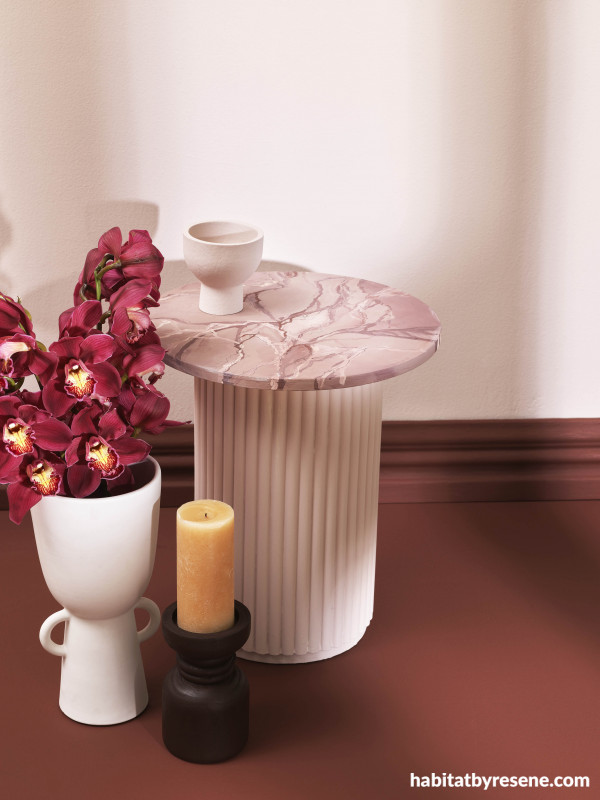 Additional visual texture can be added to furniture with paint effects that mimic classic materials, such as marble or granite. Wall, bowl and table base painted in Resene Contented, floor and skirting board in Resene Trek, hand-painted faux marble effect tabletop in Resene Contented, Resene Trek, Resene Otter and Resene Half Tea, vase in Resene Half Tea and candlestick holder finished in Resene Colorwood Bark.