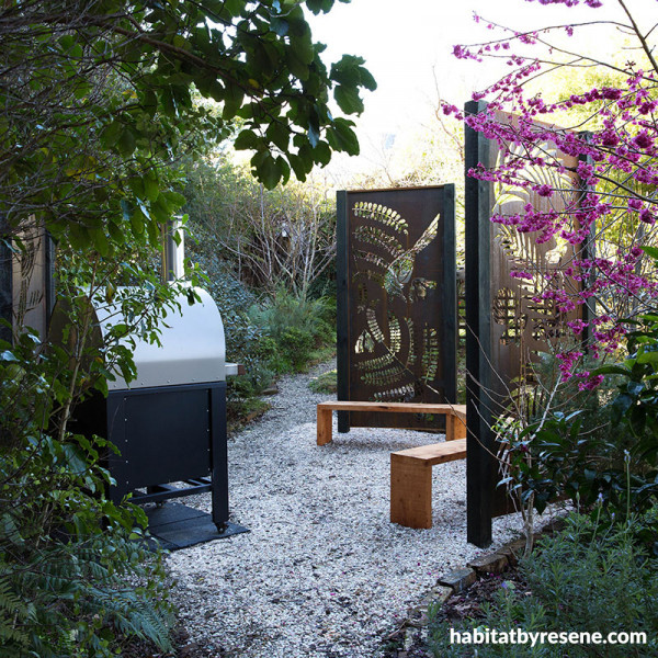 Malcolm designed these laser cut panels, which were featured on Page 19 of Issue 27 (Spring/Summer 2017/18) of habitat by Resene Magazine. Their supporting frames are stained in Resene Woodsman Crowshead. They now sit in Malcolm’s back garden, seen here.
