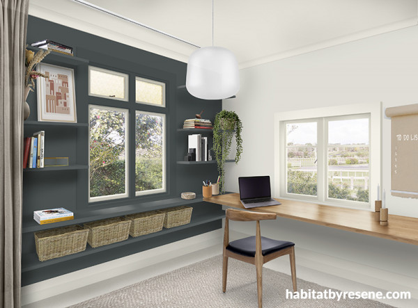 One of Malcolm’s challenges in creating the photo realistic illustrations for each Alternative Solution often involves using rendering software to ‘build’ three-dimensional objects that don’t actually exist. While it is one skill to use Photoshop to manipulate a product image of a chair, like the one above, he is often asked to create ‘custom built’ items within the illustration, like the desk and shelving – which is much more challenging to do convincingly. This Alternative Solution illustration appeared in the most recent issue of habitat by Resene magazine (Issue 32 | Autumn/Winter 2020) and was dreamed up by designer Deanna Hills. The left accent wall is in Resene Dark Slate, the right wall is in Resene Sea Fog, the ceiling and trims are in Resene Alabaster and the desk is stained in Resene Colorwood Limed Oak.
