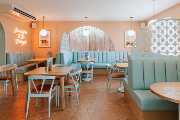 Local engineers designed and built a custom neon sign that is positioned above the entry to the shop and a local upholsterer built a candy-striped awning in coral and white to bring that retro vibe and ensure this exterior palette makes its presence felt as you approach the site.