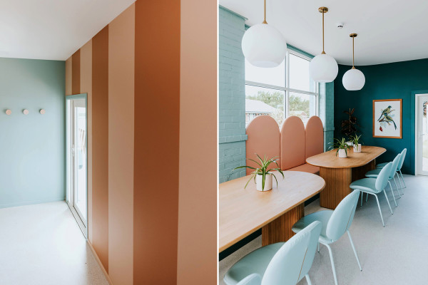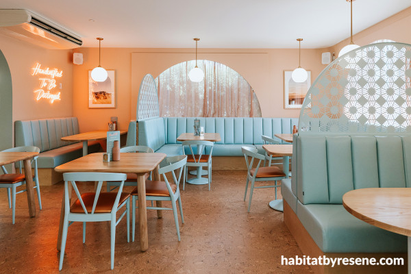 Inside, layers of soft and rich hues using Resene SpaceCote Low Sheen and Resene Lustacryl in Resene Quarter Kalgoorie Sands, Resene Sorrento and Resene Casal, alongside custom joinery and retro details reflect both the diner’s history and Whitestone’s personality.