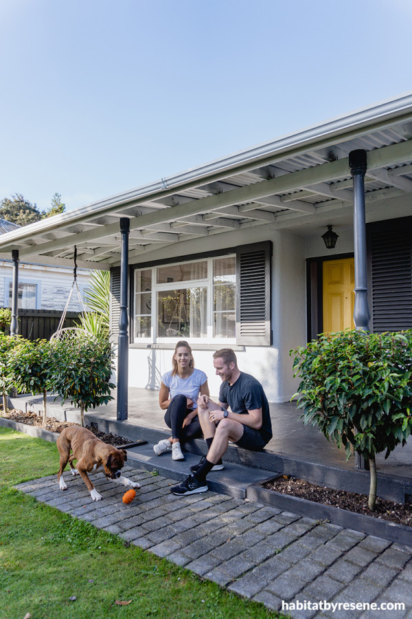 Shayden and Georgia, the design duo behind Moochstyle, outside their Christchurch home. They replaced their spouting with Marley Classic in white during their renovation to coordinate with their Resene Black White exterior. The shutters, trims, patio surface and veranda supports are painted in Resene Element and the door is in Resene Wild Thing.