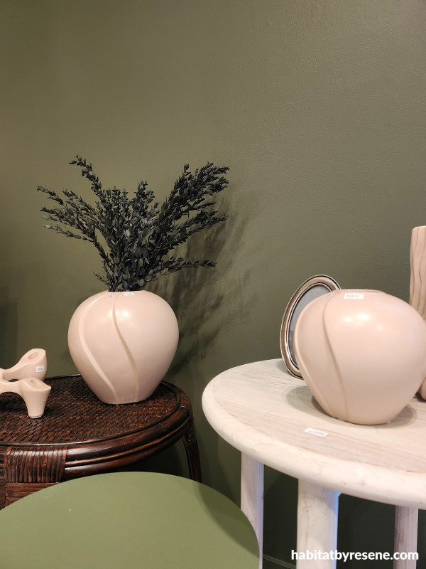 Creating inspiration for designers, May Time showcase their stunning homeware range against on-trend colours. The left wall is in Resene Kelp and right wall in Resene Double Blanc.