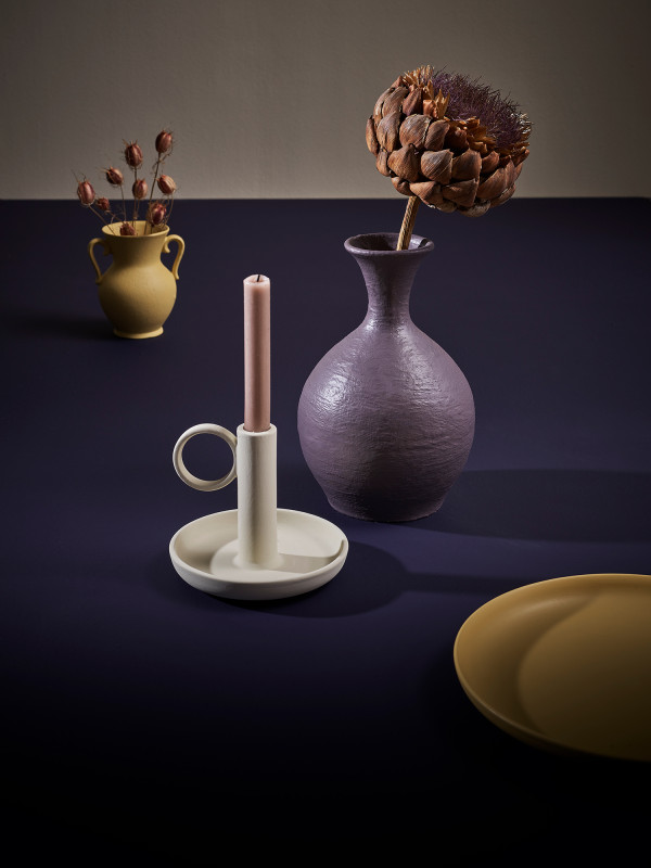 The deep purple hue on this table, in Resene Black Doris, pairs well with biscuity beige tones like Resene Athena (wall) and Resene Creme De La Creme, lighter purples like Resene Tenor (large vase) and mustards like Resene See The Light (vase and plate).