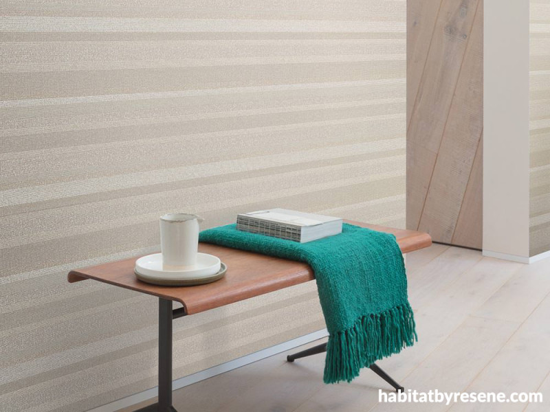 For a space that’s all buttoned up, Resene Wallpaper Collection 24137 is about as formal as striped designs come. The restrained greige colour palette lends a refined look evocative of men’s wool suiting. To keep your space from feeling stiff, eschew carpeting for timber flooring in a warm wood stain like Resene Colorwood Natural and choose furniture that has casual or vintage details in hues like Resene Concrete, Resene Quarter Perfect Taupe and Resene Half Sandstone and bring in a hefty dose of an approachable creamy white like Resene Half Villa White.