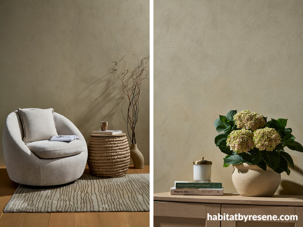 Wall painted in Resene MyArtisan Foundation Coat inSisal using a crosshatch technique, floor stained in Colorwood Bask, chair from Danske Møbler, vase in Double Sisal.