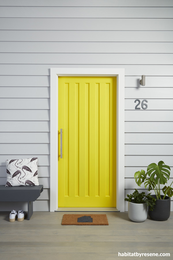 This door in Resene Turbo makes a serious style statement against trims in Resene Black White and cladding in Resene Lumbersider Low Sheen tinted to Resene Triple Concrete. For contrast, the bench has been painted Resene Tuna, the house number is in Resene Nocturnal and the plant pots are in (from left to right) Resene Lumbersider Low Sheen tinted to Resene Black White, Resene Silver Chalice and Resene Nocturnal.