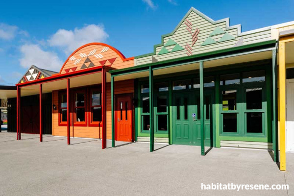 The project features Resene Bright Spark, Resene California, Resene Gelato, Resene Golden Tainoi, Resene Melting Moment, Resene Vista Blue and an extensive range of Resene colours for the wharekai artwork. Image Andy Spain, Russell Kleyn and Jeff McEwan.