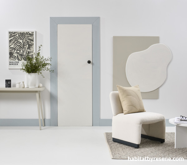Whiter shade of pale: wall painted in Resene Quarter Sea Fog, floor and door in Resene Double Sea Fog, trim in Resene Half Dusted Blue, wall art in Resene Double Sea Fog and Resene Nomad. Chair from Kiosk. Stylist: Kate Alexander. Photographer: Bryce Carleton.