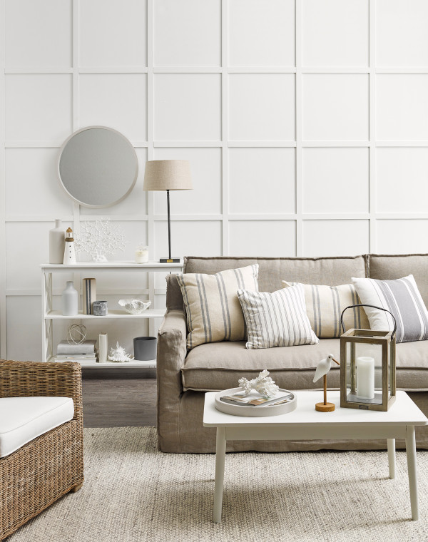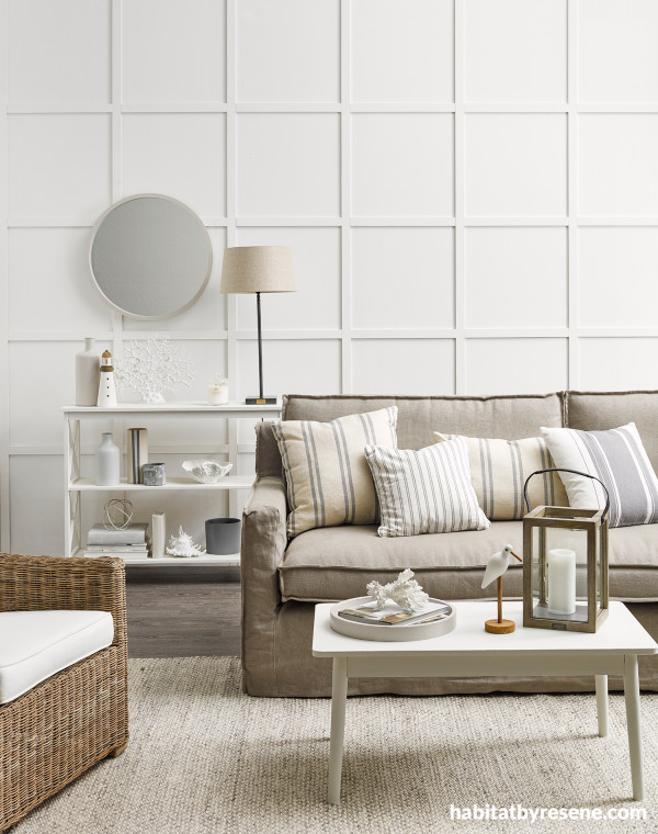 Colour me Hamptons: wall painted in Resene Black White, floor in Resene Colorwood Dark Ebony, Console and coffee table in Resene Merino. Milford Sofa in Grey from Johnston Imports/Ji Home, cushions from The French Home, Bed Bath and Beyond and Ji Home. Stylist: Vanessa Nouwens. Photographer: Wendy Fenwick.