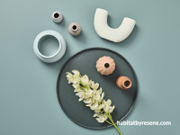 Background in Resene Unite, tray in Resene Forty Six, u-shaped vase in Resene White Noise, large vase in Resene Morning Haze and small vases in (from top left to bottom right) Resene Kinship, Resene Otter, Resene Dawn Glow and Resene Tuscany.