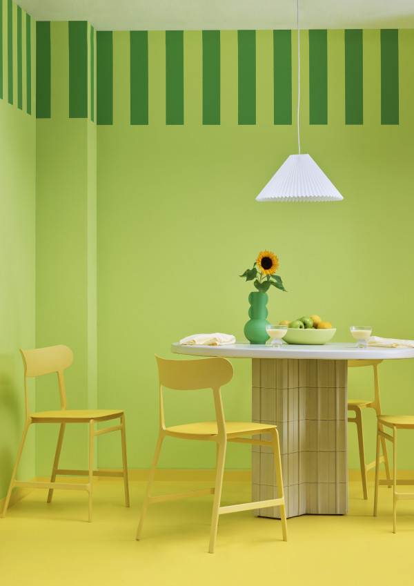 Citrus comes to life with this palette full of lemons and limes, a welcome 90’s throwback full of zing. Walls in Resene Sublime, stripe trim in Groovy and floor in Broom. Bowl in Sublime and vase in Groovy. Chairs from Noho, table from Soren Liv.