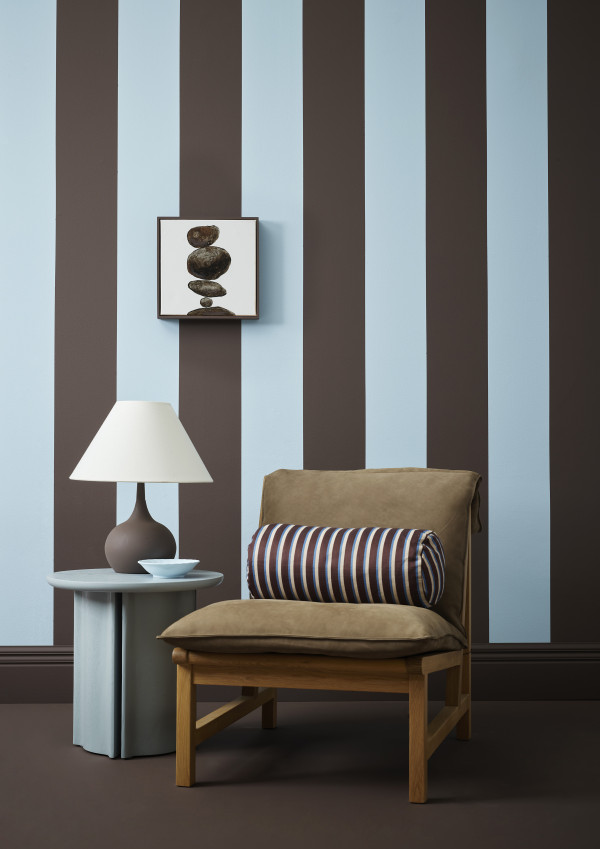 The on-trend pairing of blue and brown, leaning into the warmth of Resene Felix and pairing it with either Delta Blue or the more delicate Half Sail. Wall stripes in Half Sail and Resene Felix. Floor and skirting boards in Felix, lamp in Felix, bowl in Half Sail. Leon side table and Sketch Cantaloupe Occasional Chair from Soren Liv, cushion from Citta.