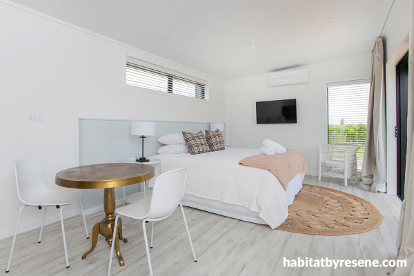 The Harvest cabin is adorned with green and golden tones to represent the different colours of the vineyard during harvest and into the autumn season. This cabin features battened walls and is painted in the smoky neutral, Resene Double Ash, which perfectly complements the Laminex headboard painted in the fresh green of Resene Bay Leaf. For the ceiling, Resene Alabaster was chosen to brighten and give an illusion of further space in a smaller area.