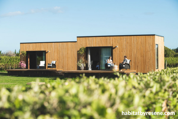 The exterior of these cosy and luxurious cabins is stained in Resene Woodsman tinted to Resene Natural, with baseboards framing the structures perfectly against the landscape and vines painted in Resene Black.