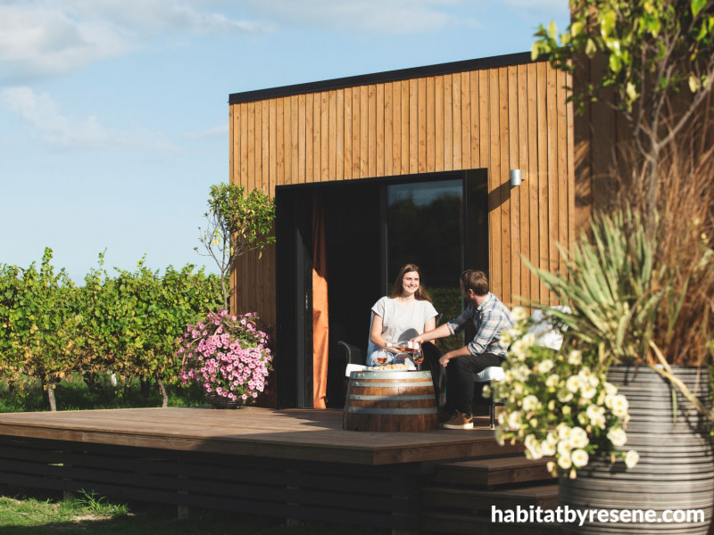Since Noir and Blanc in 2022, two new cabins have since been designed in 2023, called Blanc and Harvest. The Blanc cabin offers a simple, crisp white palette, drawing inspiration from the white wine varieties offered at Matawhero. This luxury cabin is designed to draw in the natural elements surrounding its small but comfortable space, and is painted in Resene Triple Alabaster with the ceiling in Resene Alabaster. The elegant tongue-and-groove headboard is painted in Resene Breathless, a cool blend of blue, lilac and grey with an inspirational and airy ambiance. The baseboards to the exterior decking are stained in Resene Woodsman tinted to the striking shade of Resene Tiri.