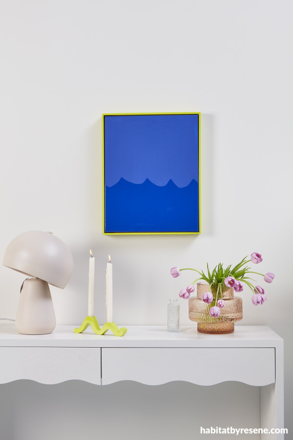 Wall painted in Resene Joanna, artwork in Resene Decadence with wave design created by overcoating in Resene Concrete Clear gloss and frame and candleholders in Resene Enamacryl gloss tinted to Resene Neva. Table and lamp from Soren Liv.