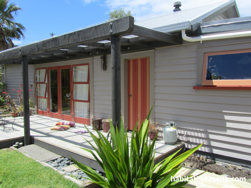Yellow is a tricky colour to use outside. How about orange instead? Cathy Hanlon chose Resene Prairie Sand and Resene Tuscany on the trims of her home and the striped front door for a fun beachy look. The weatherboards are Resene Zorba, the window trims are Resene Squirrel and the pergola is Resene Tiri from the Resene Woodsman stains range.