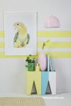 Kate electrified the Resene Sea Fog walls in this lounge with stripes of Resene Honeysuckle to reflect the canary tones in this parrot art print by Margaret Petchell. The pendant lamp and large vase in Resene Princess pinks up the pink undertones of the feathers while the plant pot in Resene Away We Go plays off the wings and the section of the peg stool in Resene Yes Please brings the blue of the ribbon off the wall and into the space.