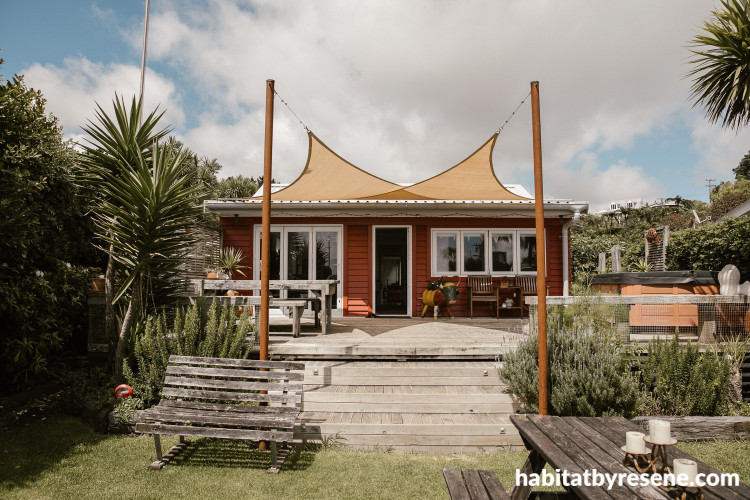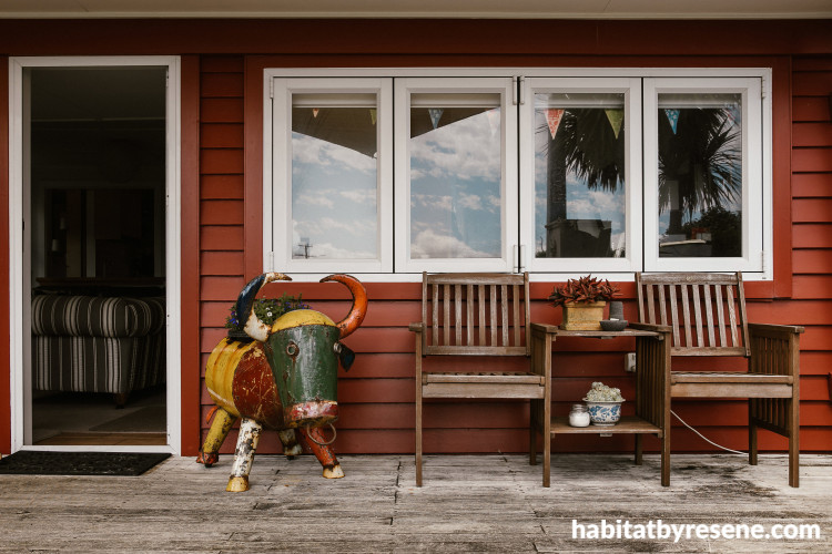 Using Resene Pioneer Red for the exterior was inspired by the red rust that metals turn to when exposed to the ocean. The trims are painted in Resene Black White.