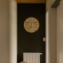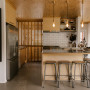 A timber feature door separates the scullery in the kitchen, while still allowing light to filter through. The walls are painted in Resene Sea Fog.