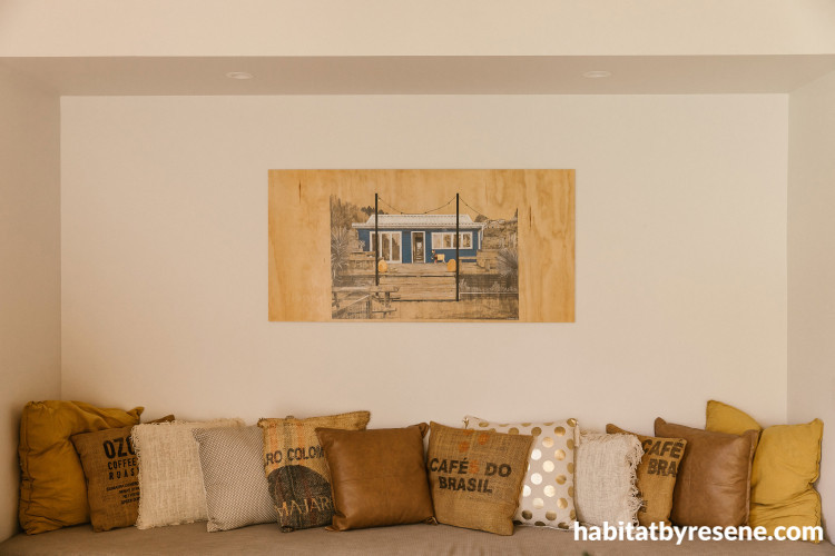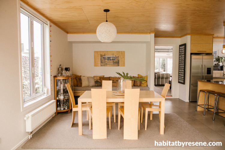 Elements of the beach are part of the home’s interior scheme. The walls are painted in Resene Sea Fog with a feature wall in Resene Gravel – Anna was drawn to how the warm neutral sits alongside the timber ceiling.