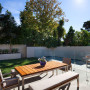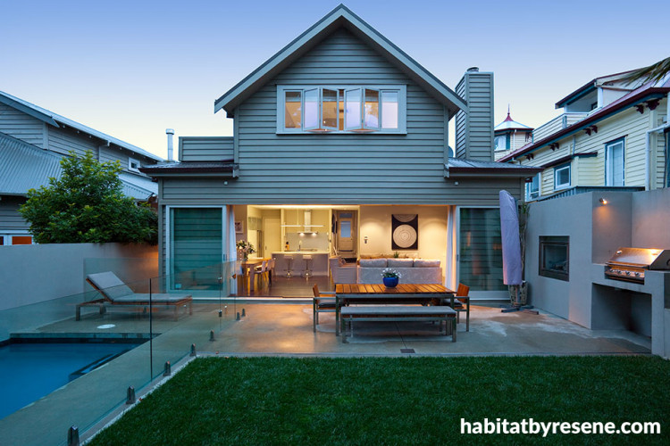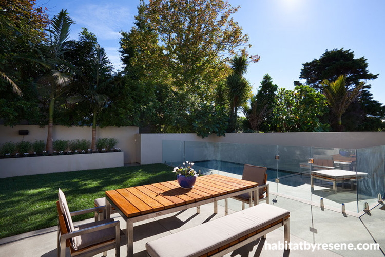 The garden and pool area have been stylishly landscaped, with walls painted in Resene Stonewall to complement the surrounding lush native flora.
