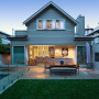 The house at twilight. The exterior of the house, and the garden walls, have been painted in various strengths of Resene Stonewall.