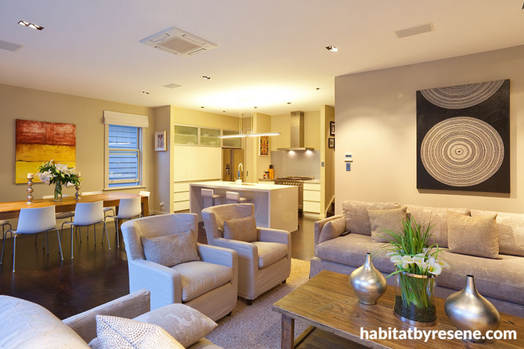In the evening, the Resene Stonewall interior of the house takes on a more golden glow.