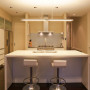 A sleek, modern kitchen has been created by housing everything out of sight in large white cupboards and drawers. The counter doubles as a breakfast bar.