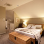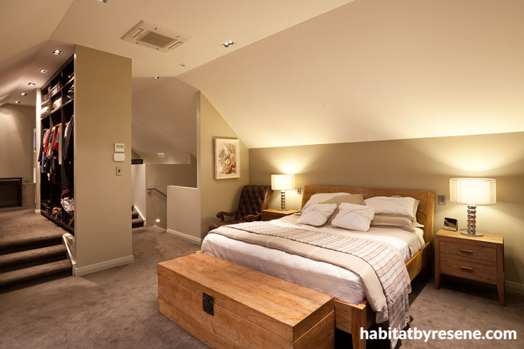 The master bedroom, painted in Resene Double Fossil, has a large walk-through dressing area.