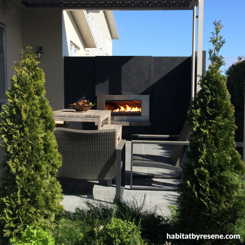 This small outdoor living area was redesigned by Sandra Batley of Flourish Garden Concepts to include a stand-alone feature wall with a built-in gas fire. The bold, dark charcoal of Resene Double Foundry creates a dramatic focal point in the space and a punchy contrast to the neutral colours of the house. It also sets off the modern stainless steel fascia of the fireplace beautifully and works in well with the honed, grey concrete courtyard floors and neutral-coloured outdoor furniture. For more of Sandra’s work, see www.flourishgardens.co.nz.